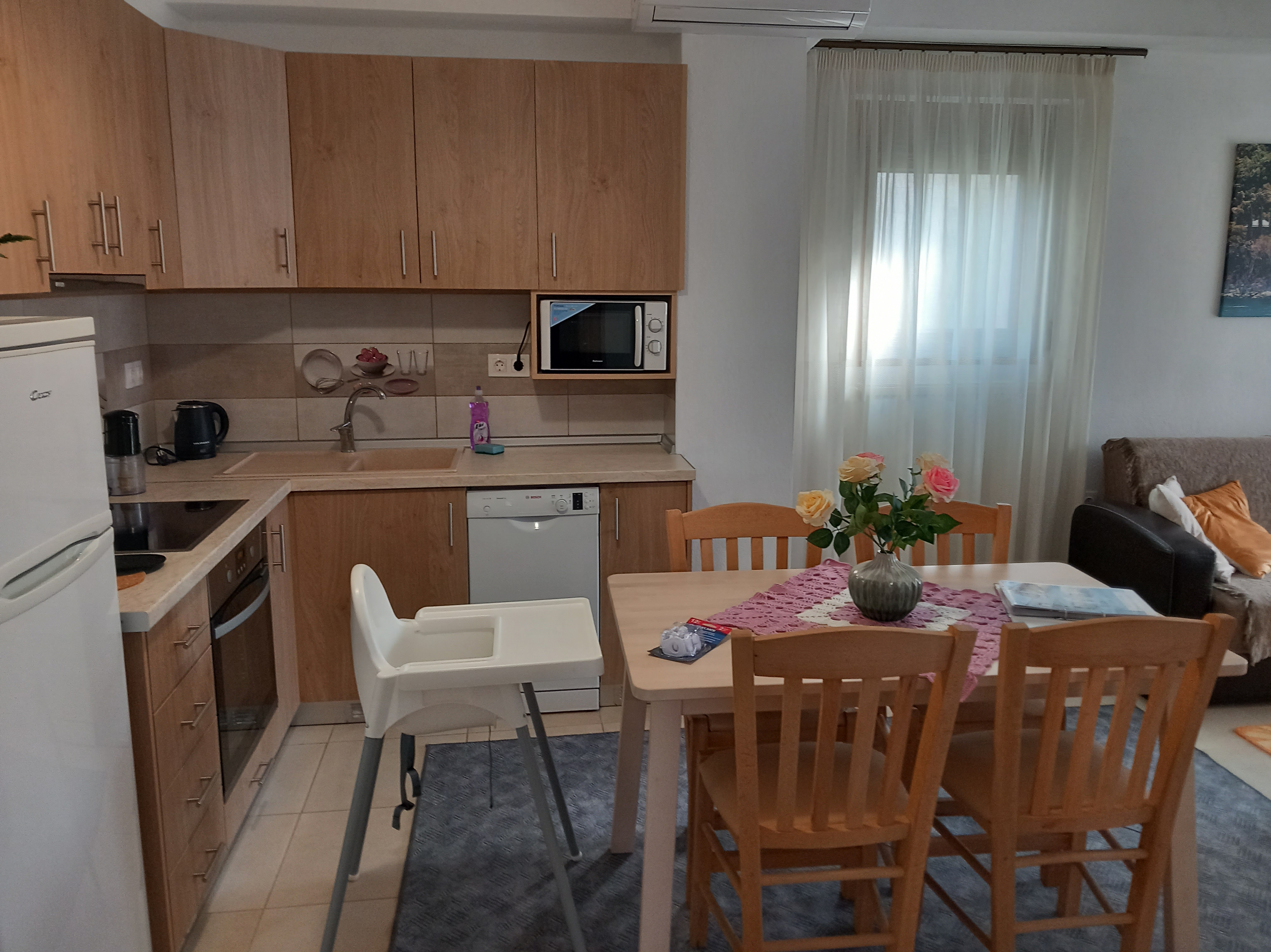 The kitchen is fully equipped and includes coffee maker, water kettle, microwave oven, dishwasher, stove, refrigerator and iron.
