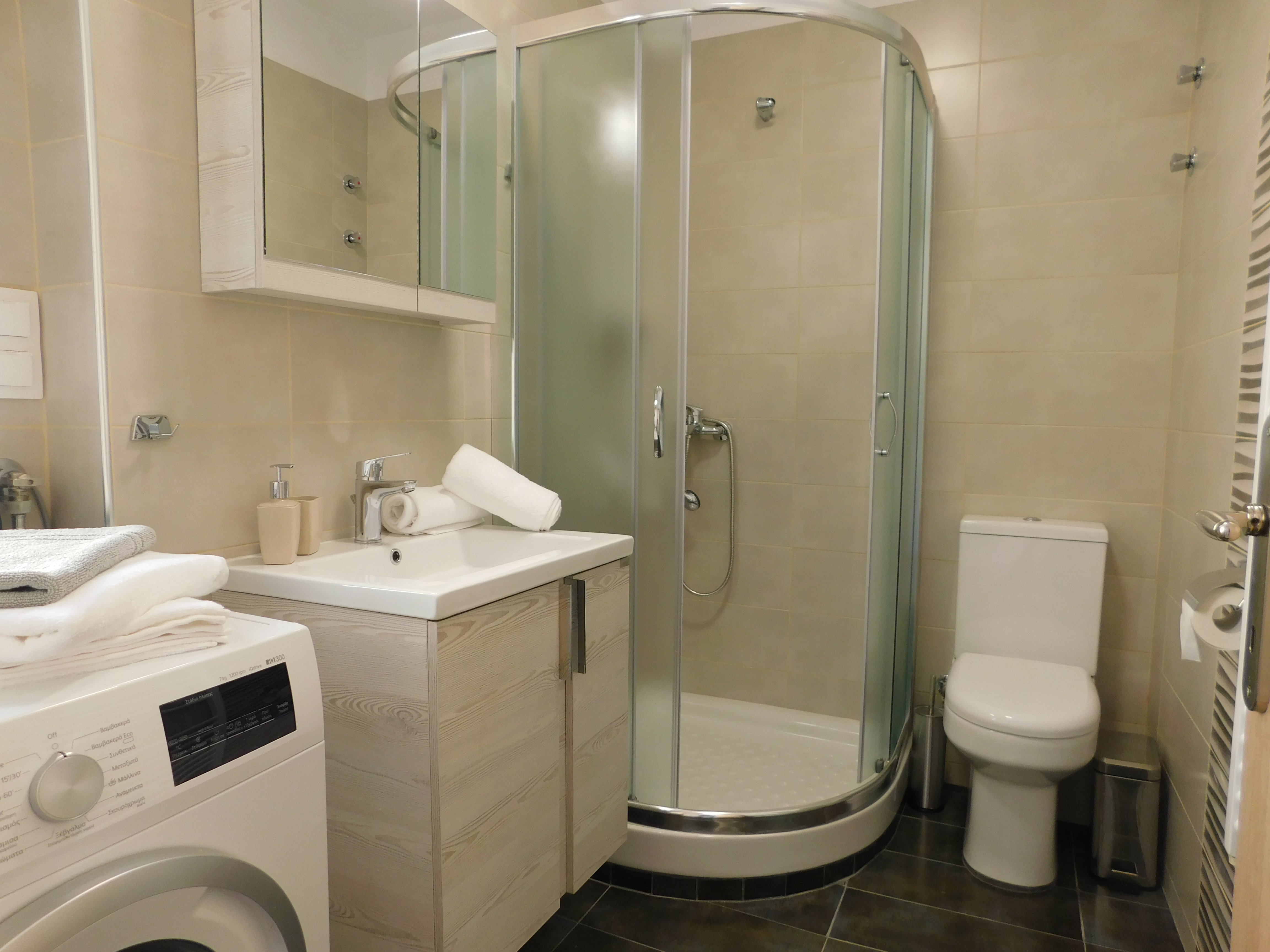 In the bathroom you will find a washing machine and a hair dryer. Hot water comes from the solar system on the roof to the bathroom and kitchen.