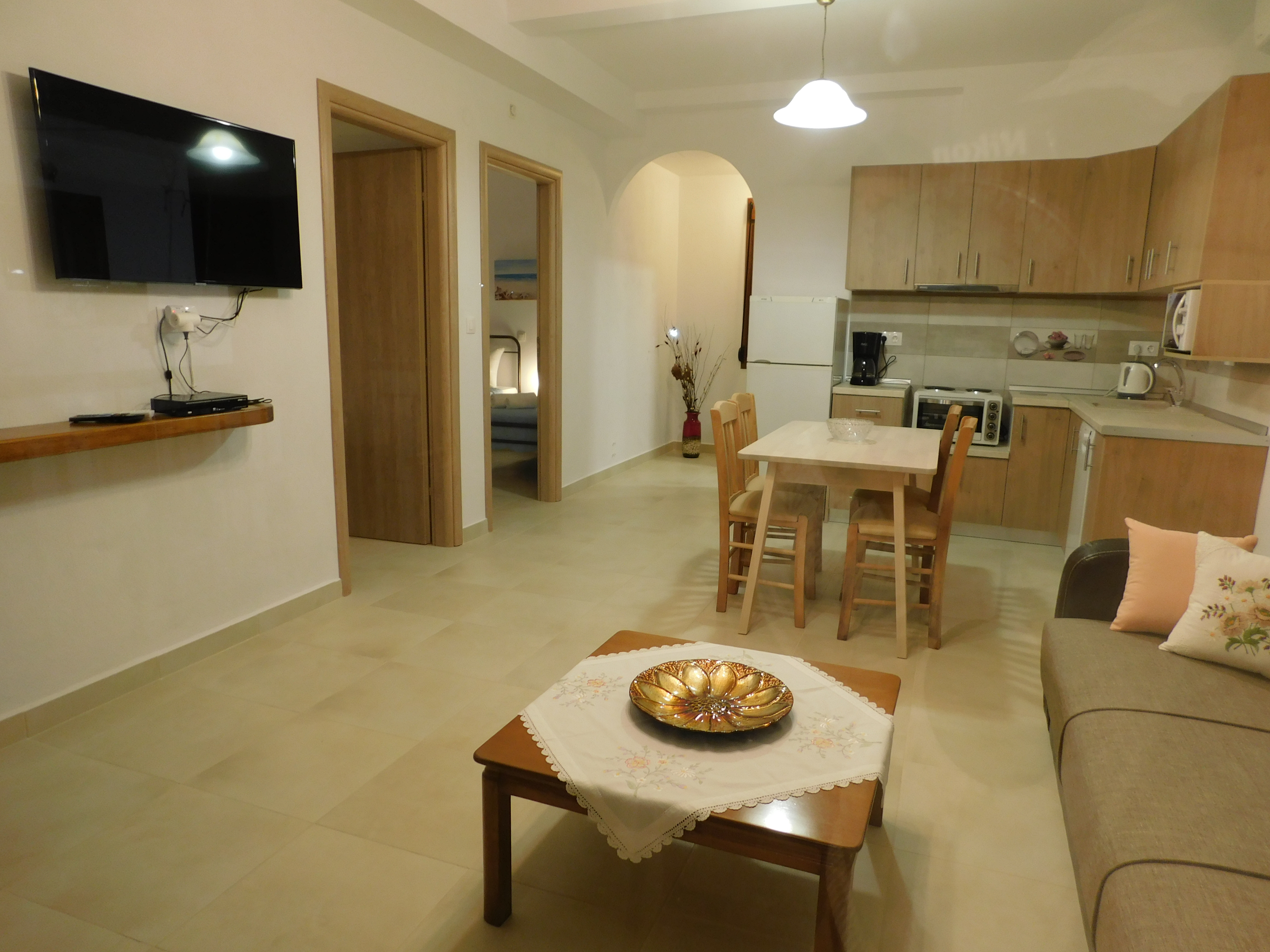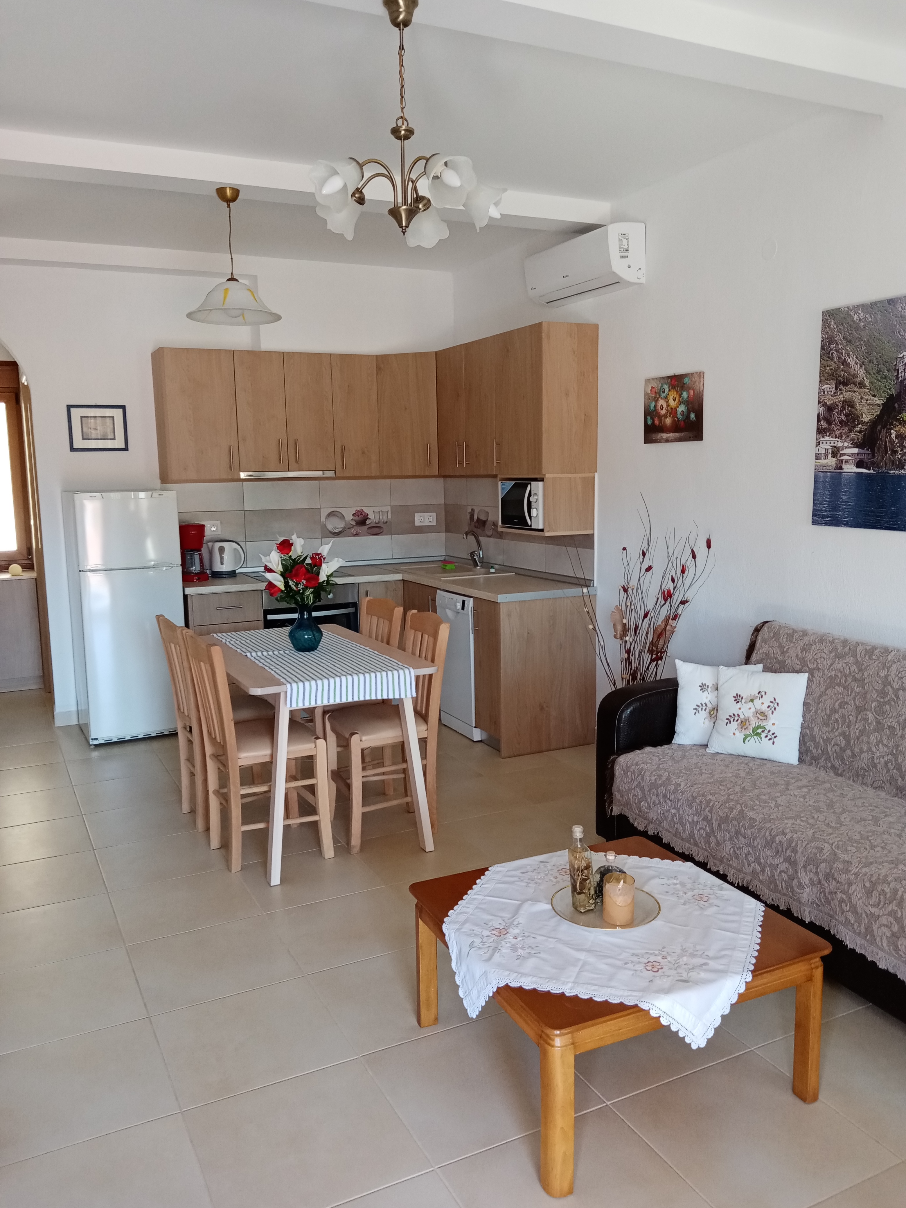 The nearest beach is just 10 minutes away by car. In a 3-5 minutes walking distance you have the bakery, a supermarket, the butcher’s, a grocery and the central square with cafes, pizza places, patisserie, greek restaurants, ice cream places and fast food.